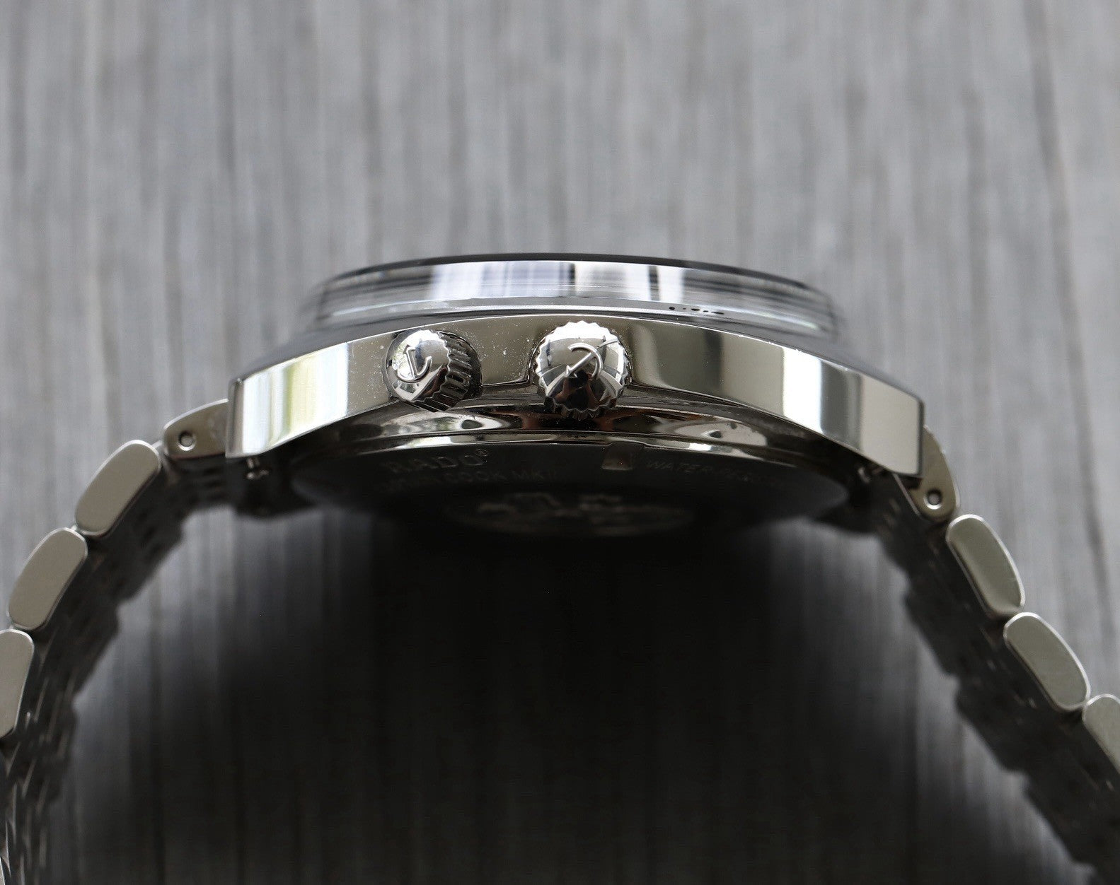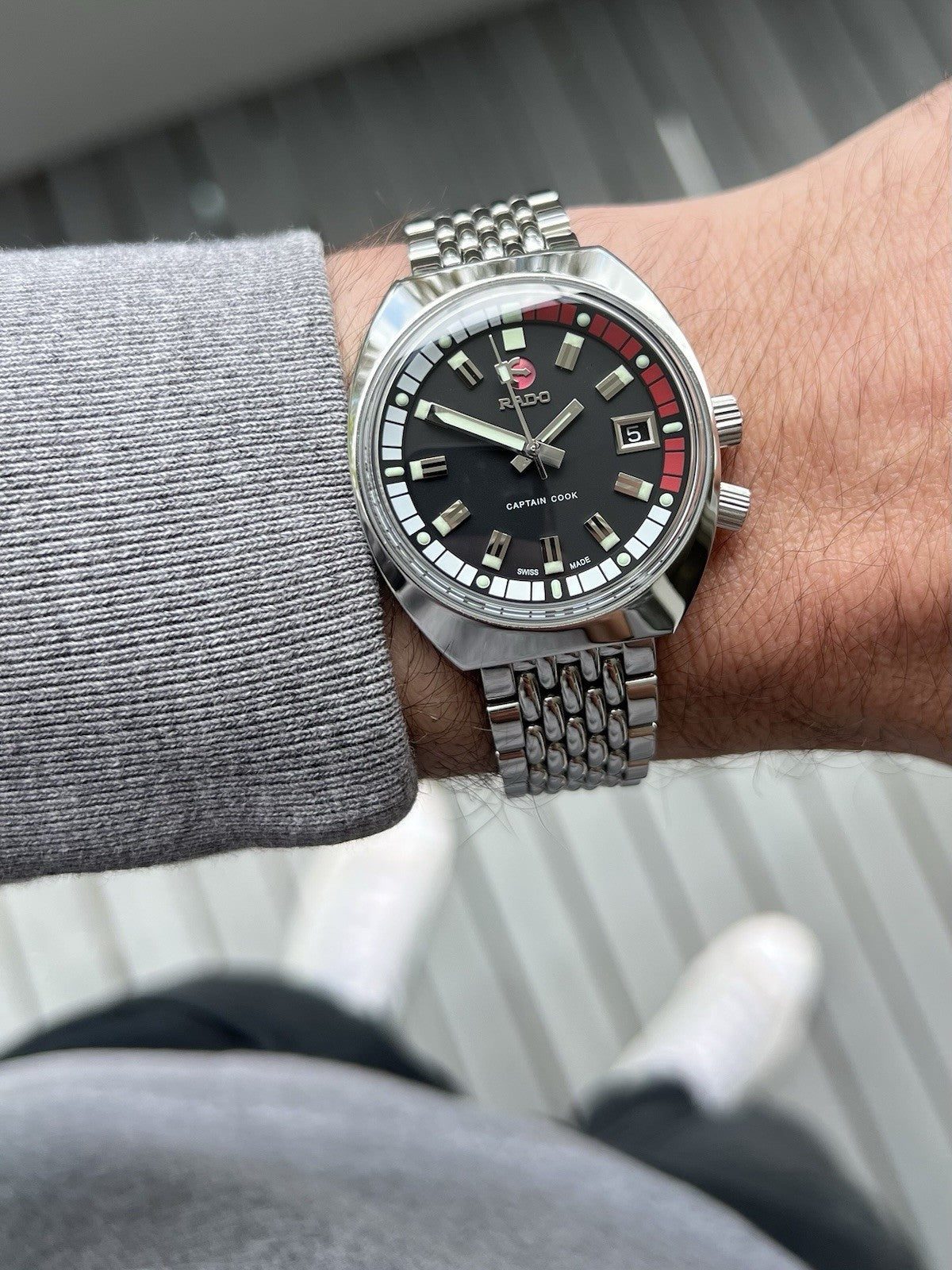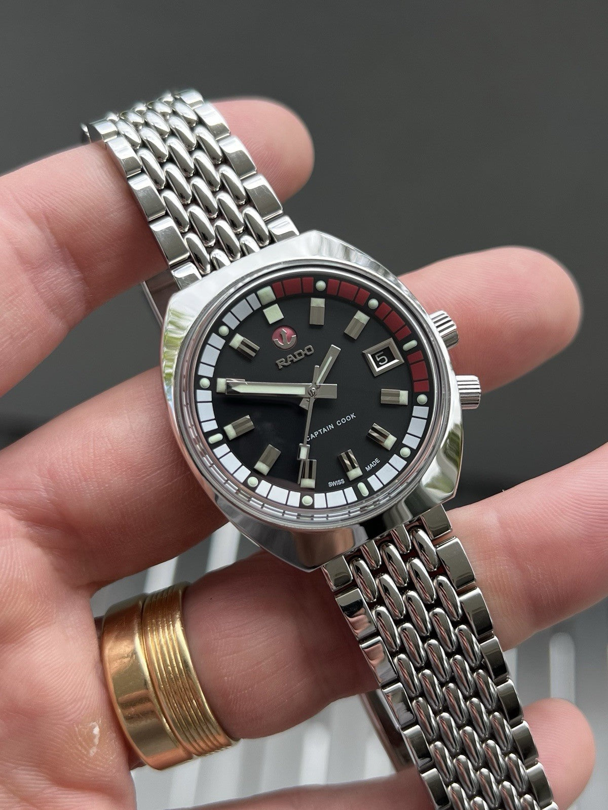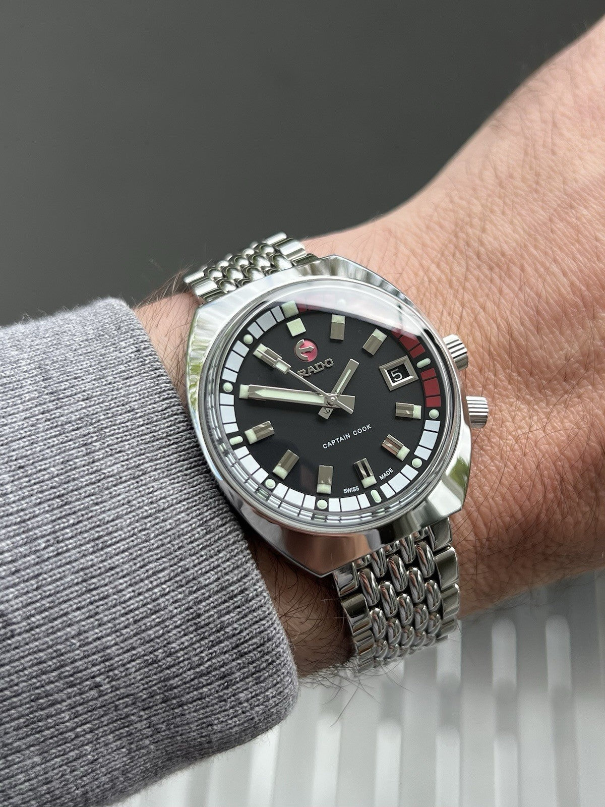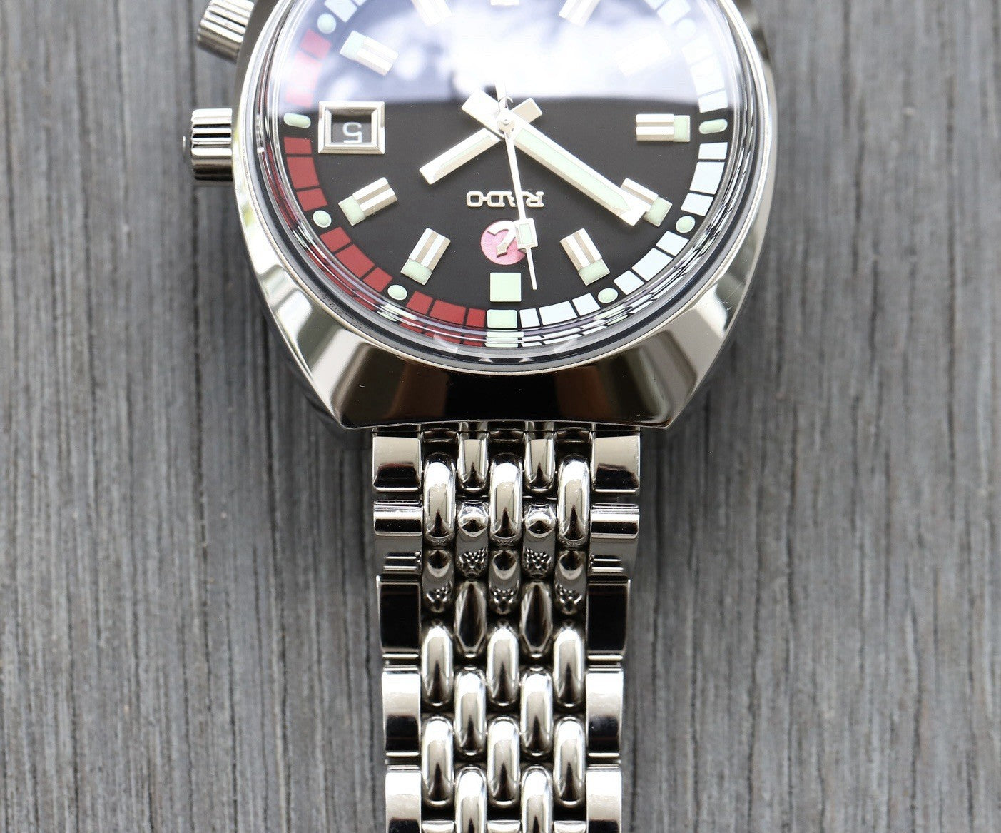 Rado again kept things very faithful to the original. The case is made of steel, and measures in at 37mm, with a lug-to-lug of 40mm, making it very compact and able to fit all wrists. Within this case lies an inner rotating bezel, with red demarcation for the first 15 minutes adding a vibrant pop of colour against the inky black dial. Markers are applied, and lume abounds on the dial, bezel and hands.
