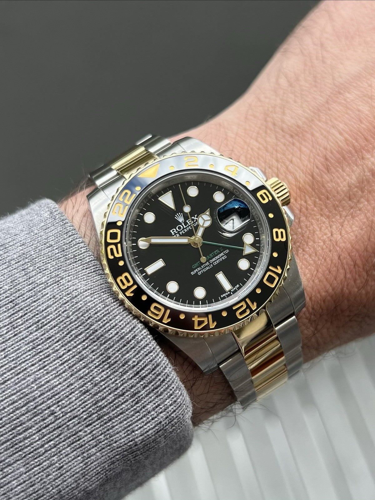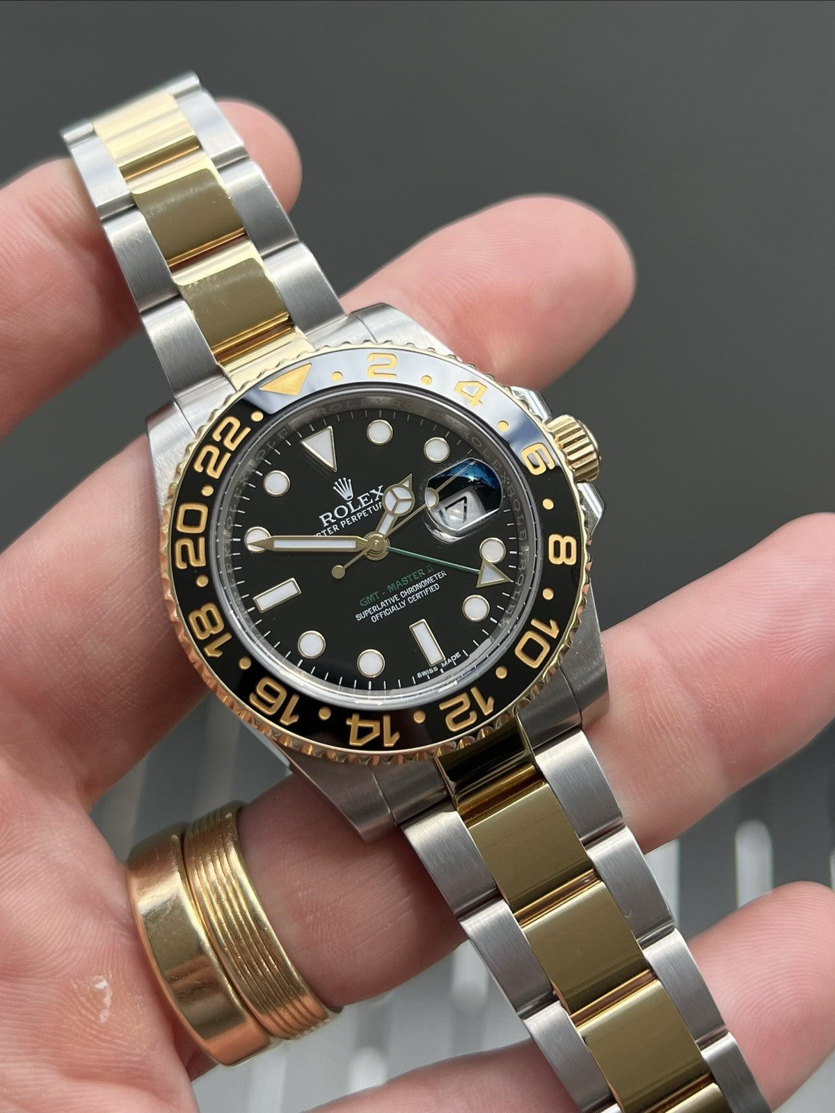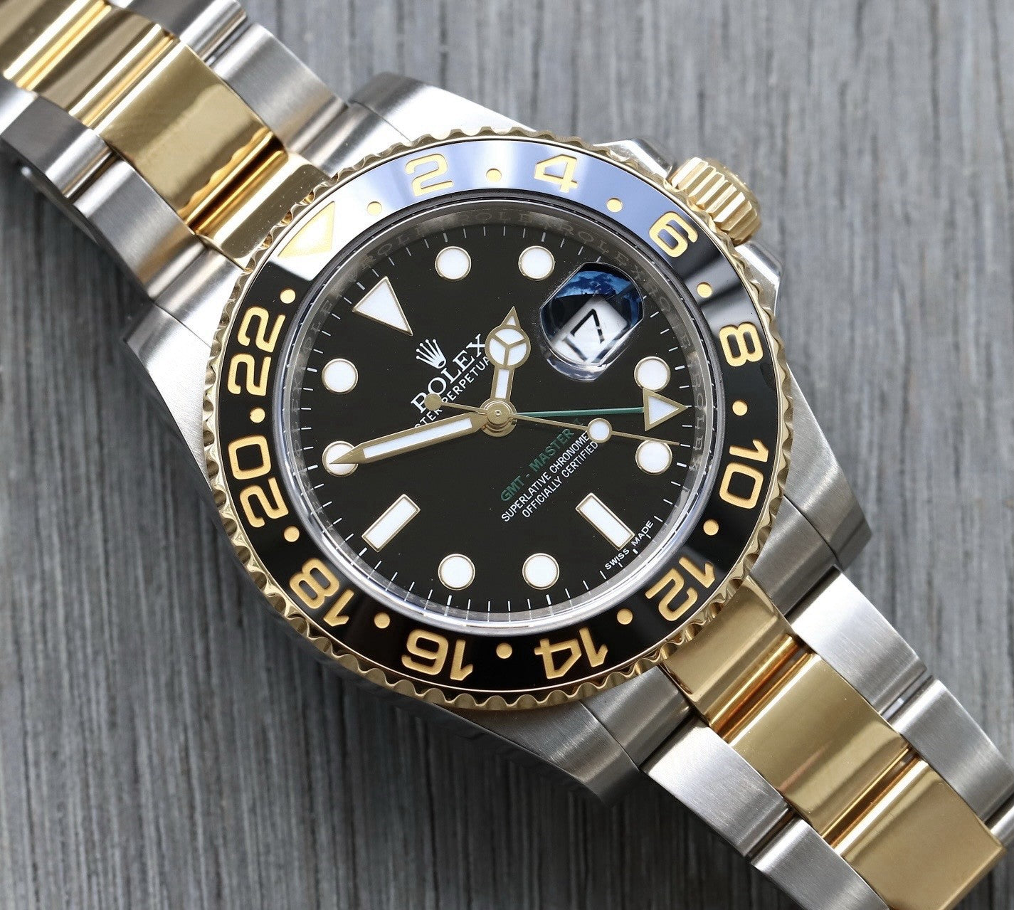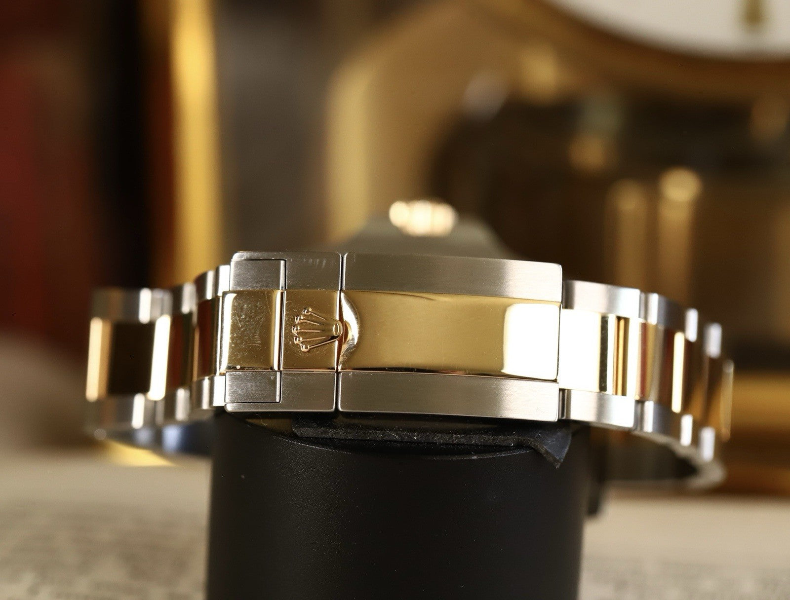 This particular version, the 116713LN, was released in 2006 and was amongst the first references to receive the new Rolex Maxi case, Maxi dial, Ceramic Bezel and Triplock Crown. Executed in two tone steel and 18k yellow gold, it's the perfect embodiment of a modern Rolex sports watch.