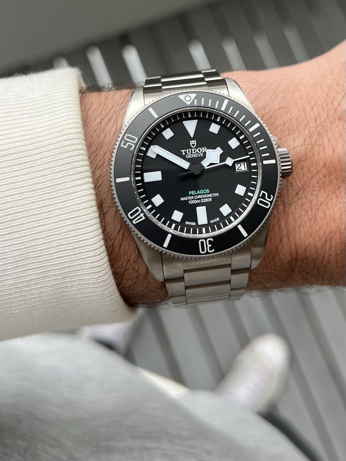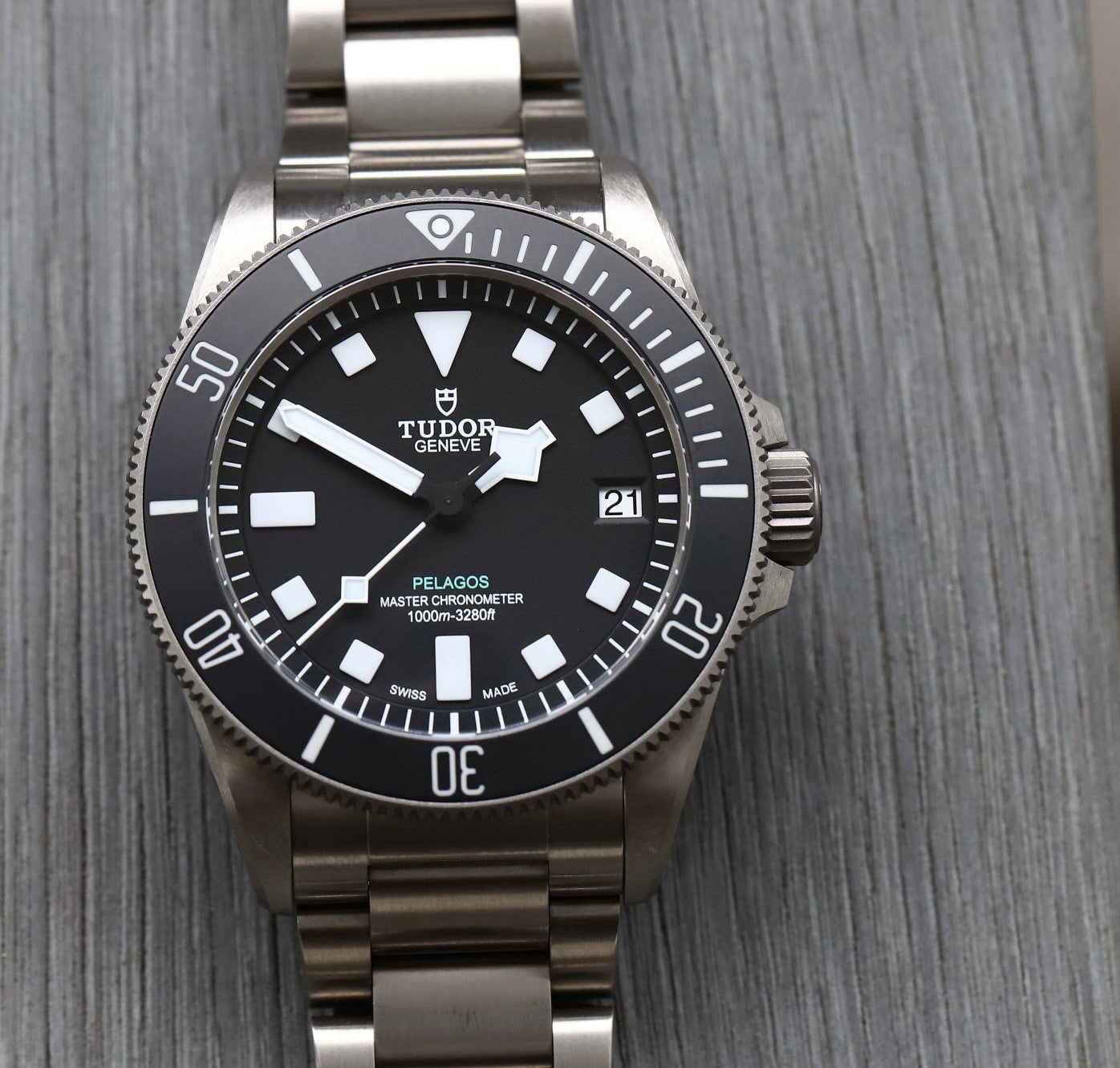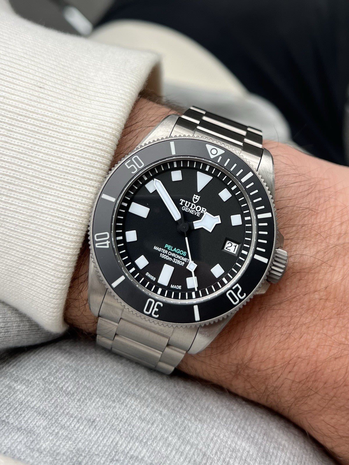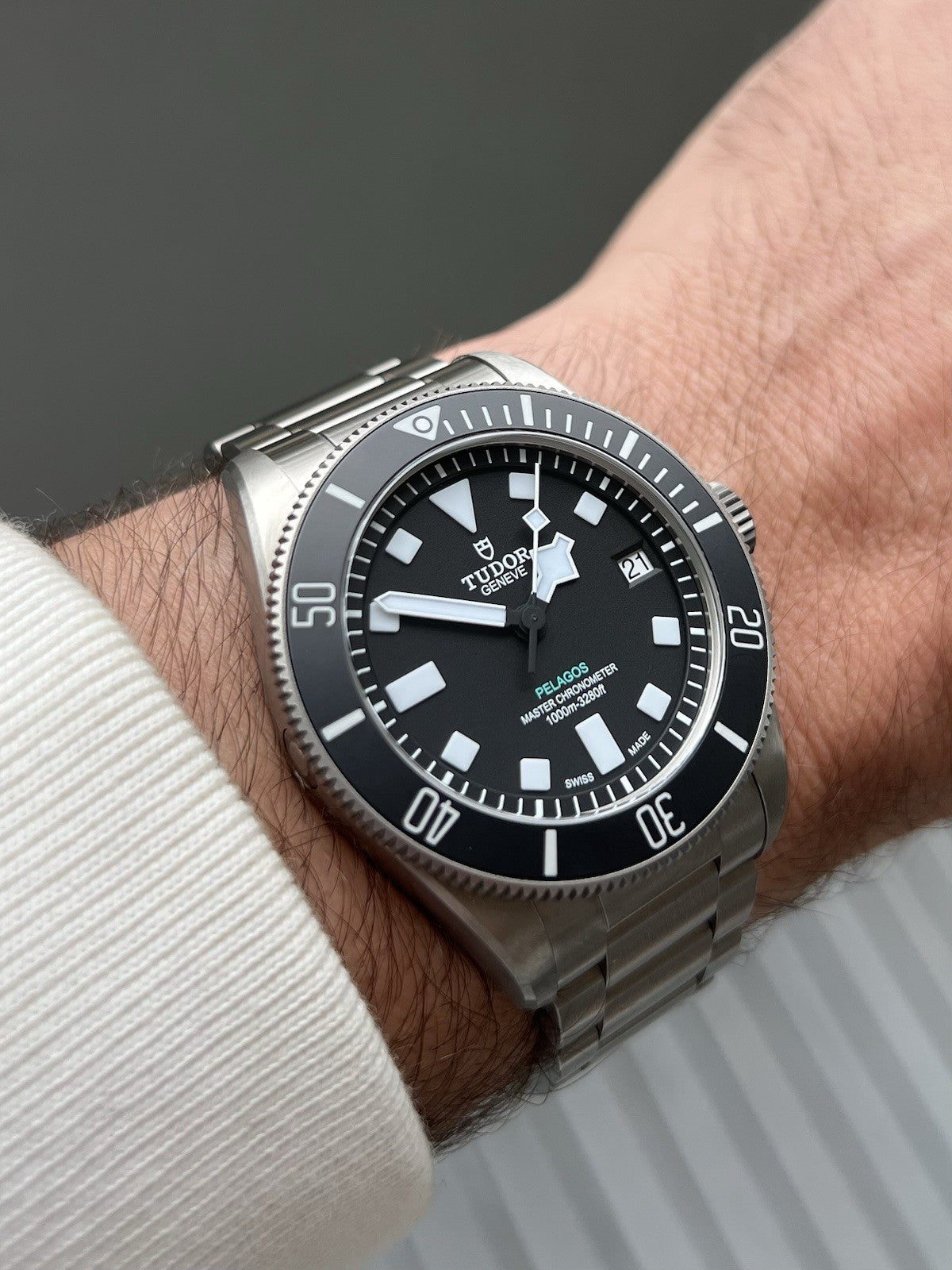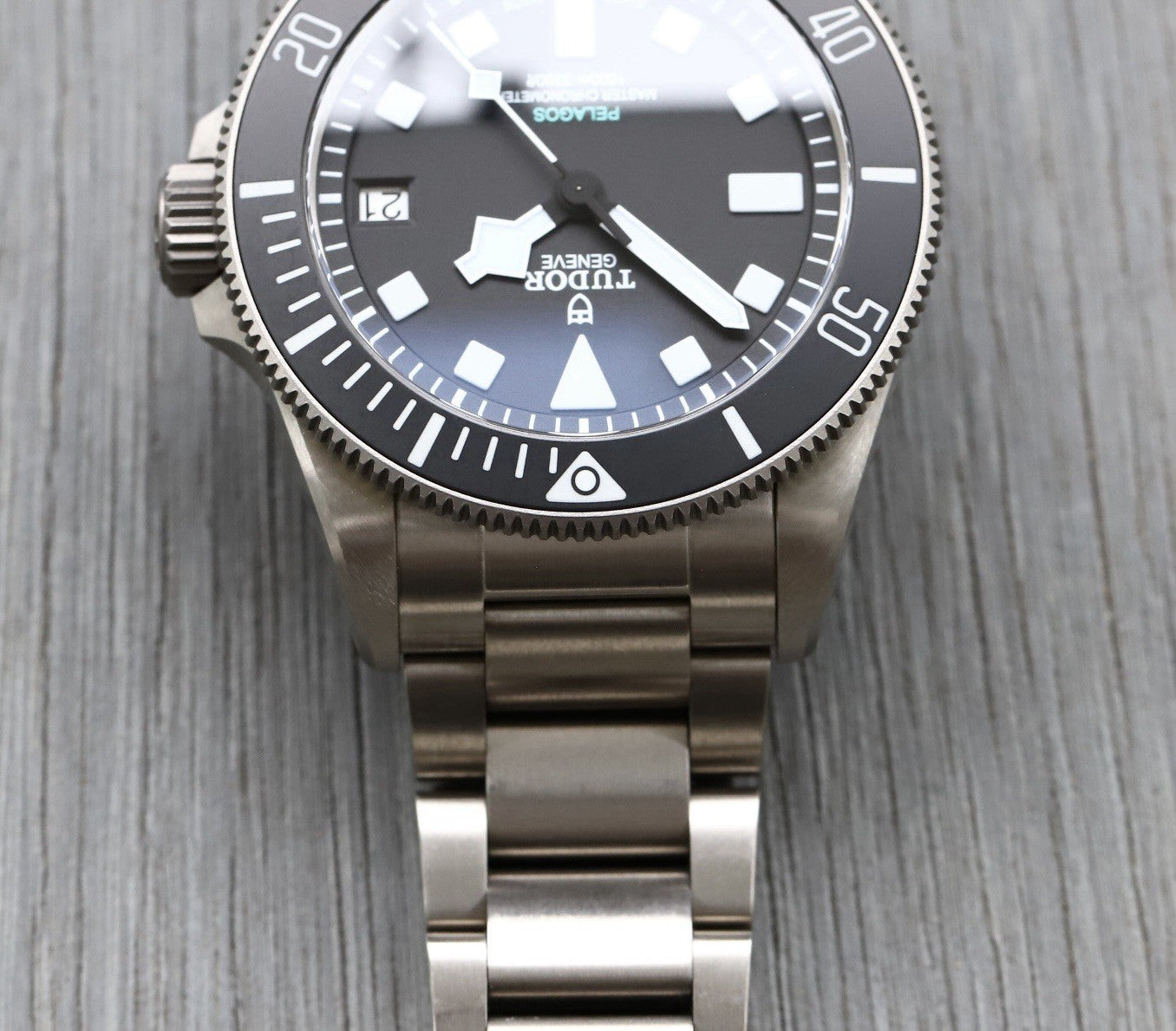Utilising a 43mm case in titanium, 1mm more than the regular Pelagos, but balanced out with its 22mm lug spacing making it feel very similar on the wrist. Thickness is 14.5mm, though feels slimmer than an original Black Bay 41 thanks to its defined bezel, mid-case and case back.