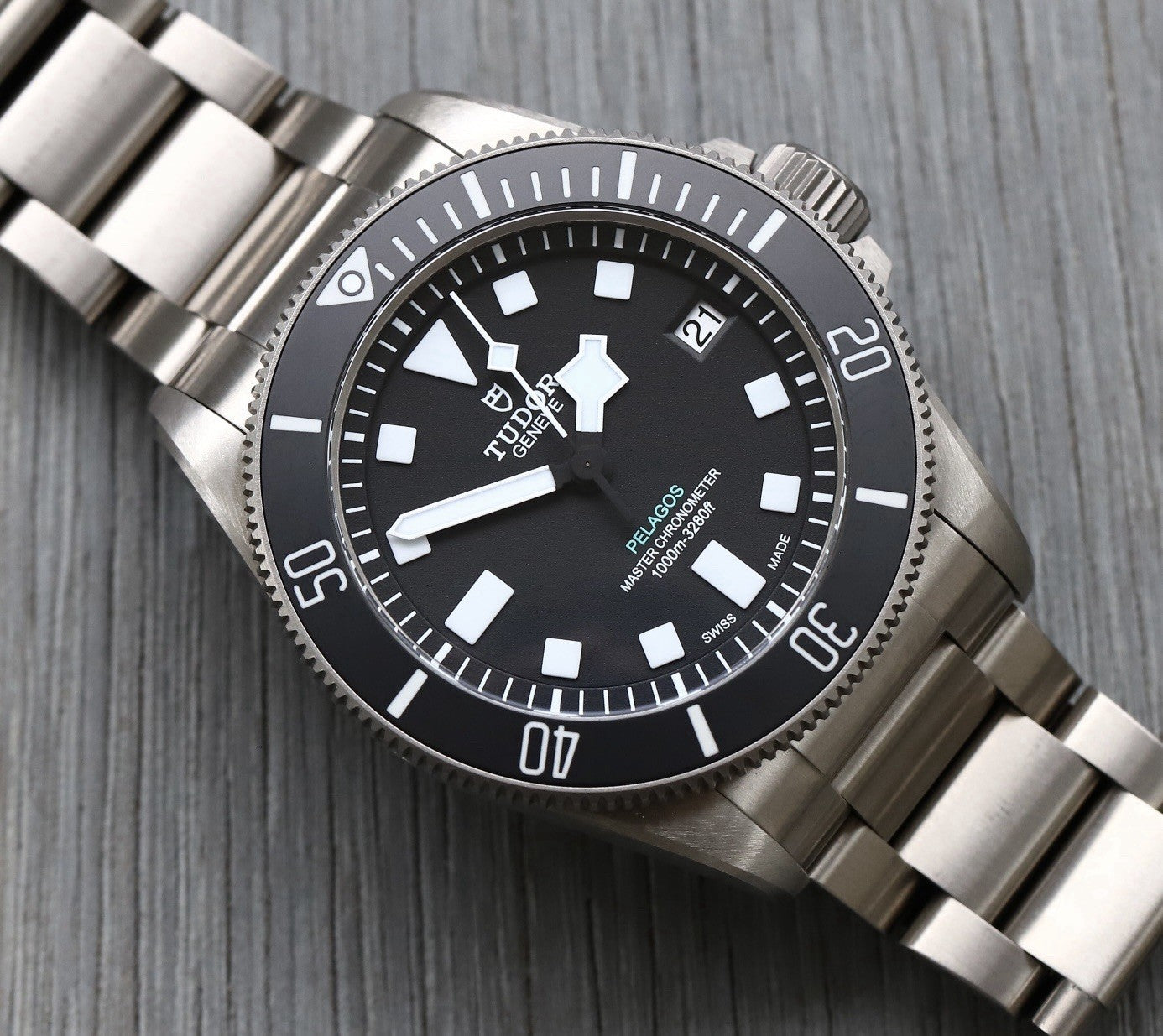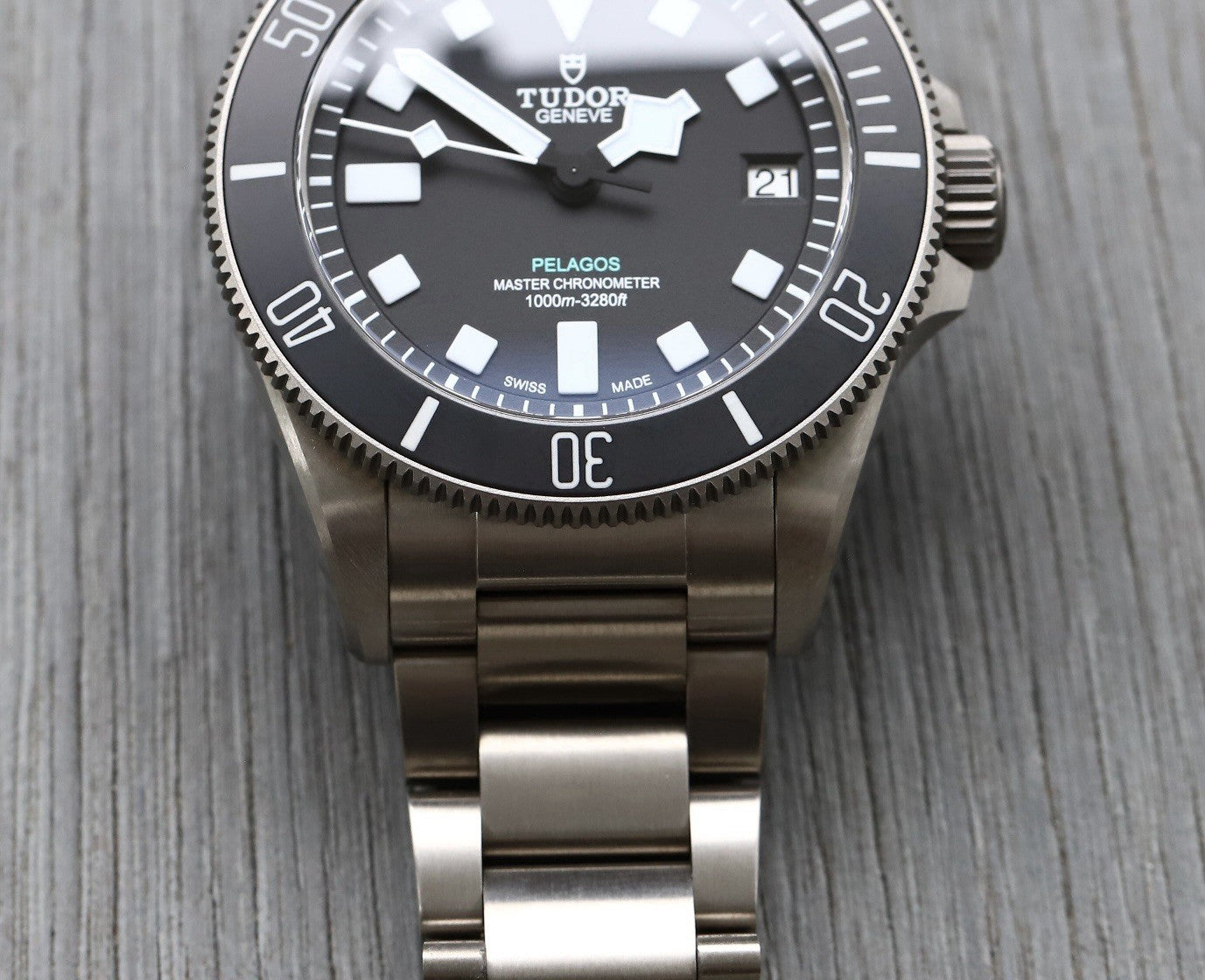It houses a super-legible black dial with white markers and classic Snowflake hands, and 'Pelagos' written in aquamarine, and is surrounded by a uni-directional dive bezel. Both are lumed to the nines, with contrasting green lume for the minute hand to aid in diving.