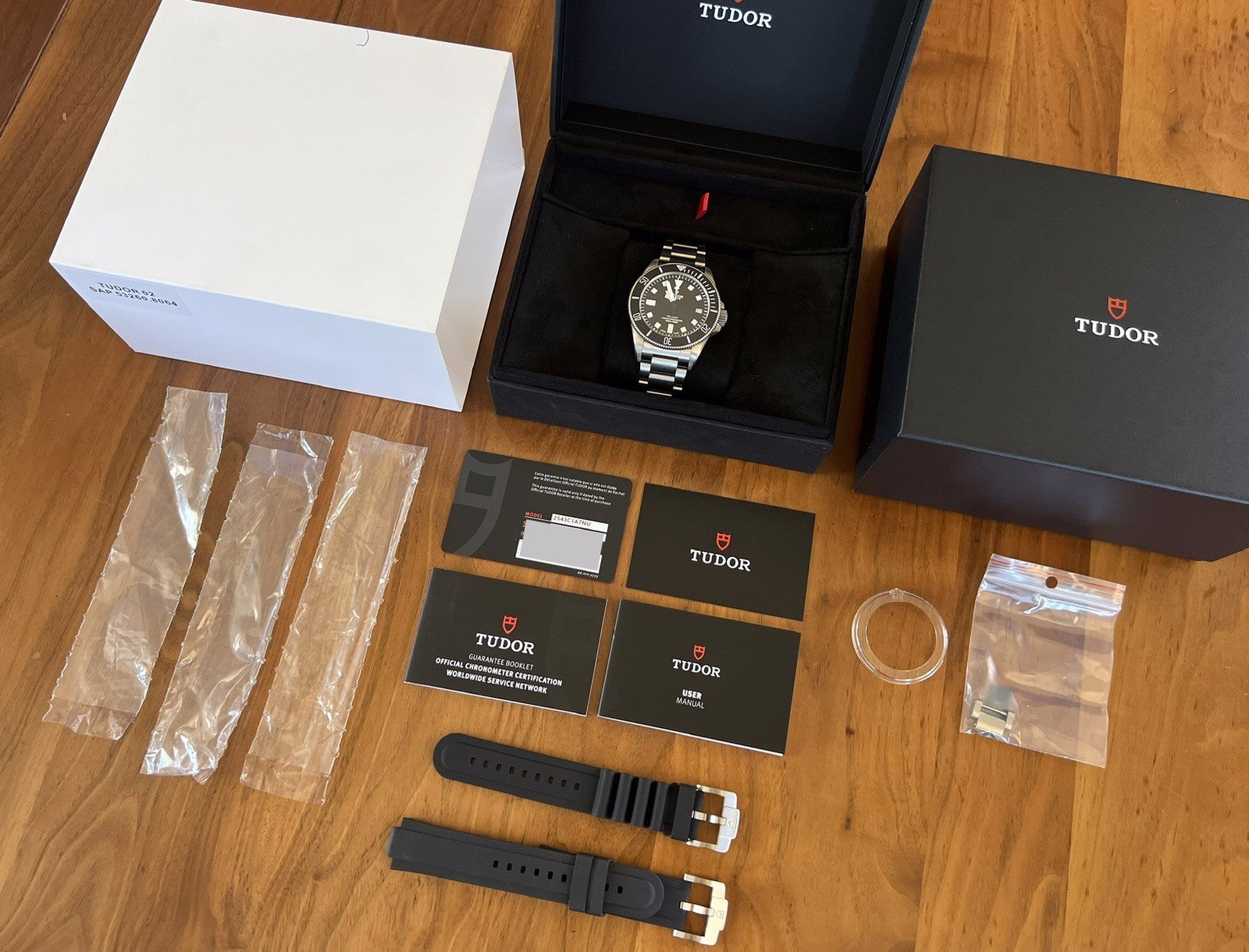 Comes with outer sleeve, outer box, inner box, instruction booklet, warranty booklet, warranty card dated June 2025, bezel protector, Tudor rubber strap and spare link to complete the bracelet.